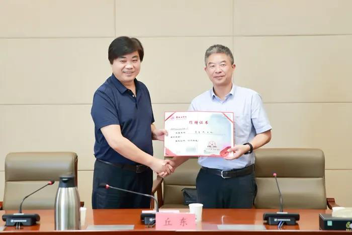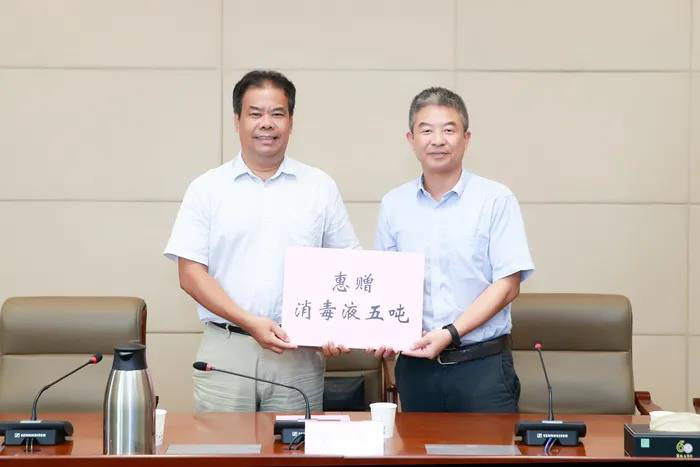 捐贈儀式上,后勤服務集團負責人代表學校接受江蘇乾寶生物科技有限公司的捐贈,宋長春向江蘇乾寶生物科技有限公司發放捐贈證書。