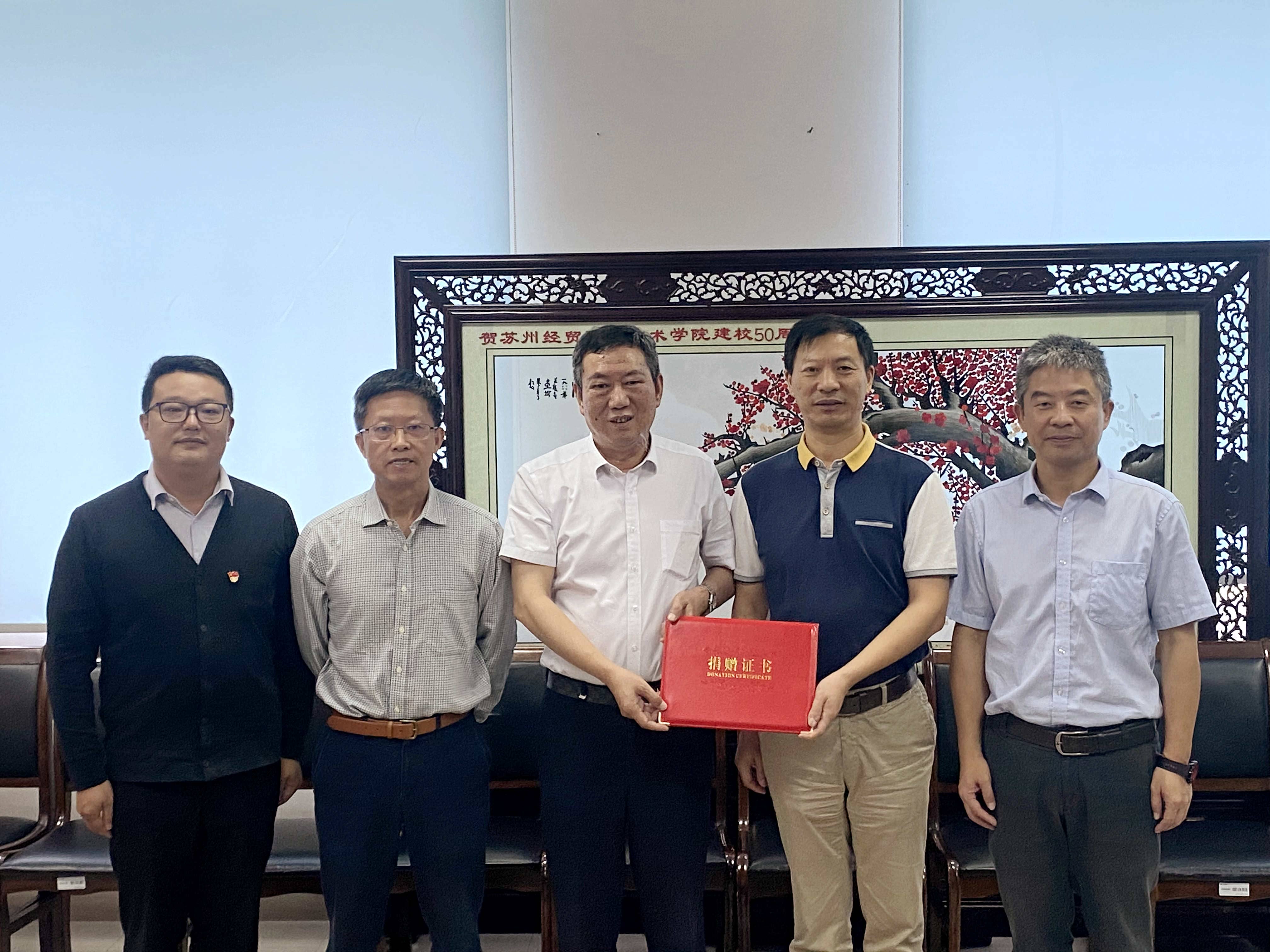 最后,雙方進行了捐贈物資的交接,蘇州經貿職業技術學院副院長沈文其向企業頒發了捐贈證書,并合影留念。