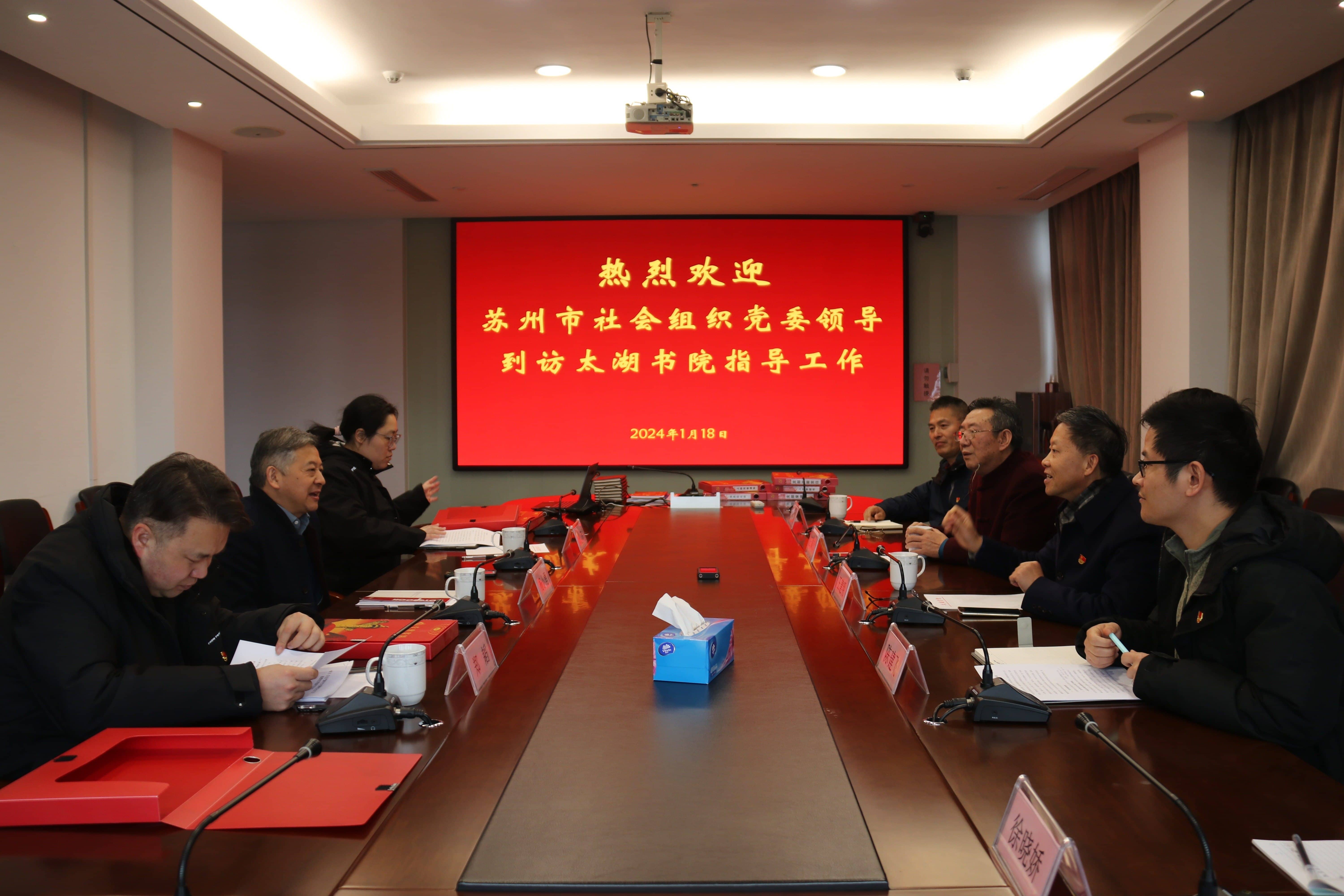 2024年1月18日下午,蘇州市社會組織黨委書記楊小勇一行到訪蘇州太湖書院指導支部工作并召開黨建座談會。太湖書院黨支部書記陳建飛、副書記徐曉嬌及部分黨員參加會議,江蘇乾寶集團總裁王翼寧,太湖書院執行院長王建明以及入黨積極分子列席會議。 會上支部書記陳建飛匯報了2023年支部工作情況以及新年度黨建工作...