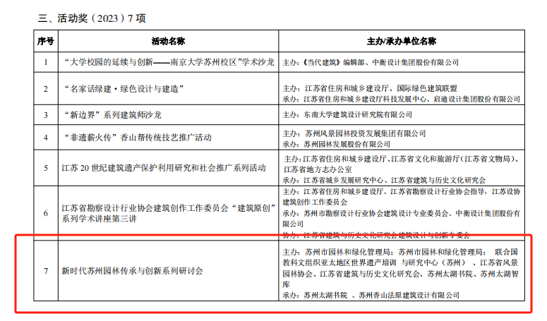 在此次優(yōu)秀成果評(píng)選中,蘇州太湖書(shū)院、蘇州太湖智庫(kù)、蘇州香山法原建筑設(shè)計(jì)有限公司聯(lián)合申報(bào)的“新時(shí)代蘇州園林承傳與創(chuàng)新系列研討會(huì)”榮獲“活動(dòng)獎(jiǎng)”。