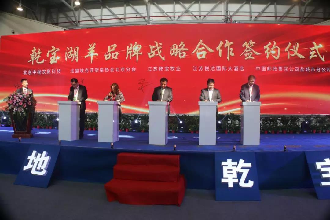 為深入挖掘乾寶湖羊文化、進一步研發(fā)和打造乾寶湖羊羊肉產(chǎn)品、不斷提升乾寶湖羊品牌在國內(nèi)外消費市場中的影響力,由江蘇乾寶牧業(yè)有限公司與北京中視農(nóng)影科技有限公司、法國埃克菲廚皇協(xié)會北京分會、悅達國際大酒店、中國郵政集團公司鹽城分公司共同簽署戰(zhàn)略協(xié)議。