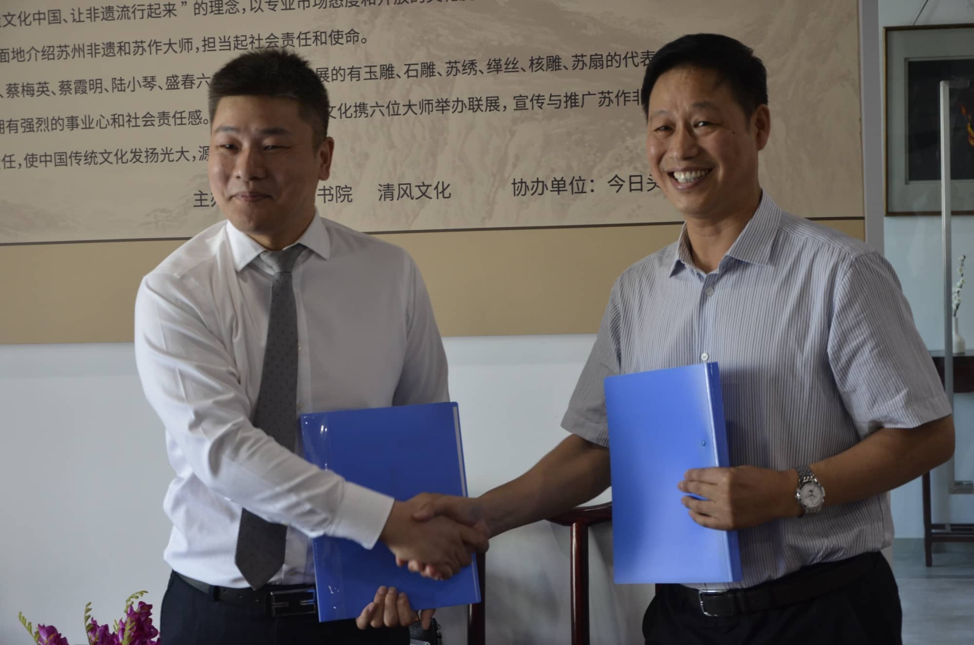 ?????? 2017年9月18日上午10點,太湖書院攜手清風文化舉辦了非遺精品展覽,拉開了太湖·清風與眾多非遺大師合作的序幕。江蘇乾寶投資集團副董事長朱波主持了揭幕儀式。參加此次非遺精品展的大師有蔡云娣,蔡梅英,蔡霞明,陸小琴,盛春,孫永等。嘉賓有江蘇乾寶投資集團董事長王躍程,陜西清風文化產權交流服務有限公司總經理李寶庫,太湖書院執行院長沈陽,江蘇乾寶投資集團執行總裁王翼寧、常務總裁王榮華,今日頭條、蘇州區房產運營總經理張會來,江蘇乾寶投資集團副總裁徐正強,太湖書院副院長丘東,陜西清風文化產權交流服務有限公司、清風非遺博物館館長任元鴻,蘇州大學教授費湘軍,陜西清風文化產權交流服務有限公司產品總監陸洋,陜西清風文化產權交流服務有限公司市場總監黃蕊卿,西安大唐古玩市場總經理唐亮等出席了展覽活動。太湖書院執行院長沈陽、清風文化非遺博物館館長任元鴻、非遺傳承人代表蔡梅英老師先后發表熱情洋溢的致辭,都希望通過此次活動弘揚主族律,傳播正維量,齊心協力把中國傳統文化發揚光大。儀式上,大師們為太湖書院·清風文化非遺傳承保護合作基地揭牌,共同見證了乾寶文化與清風文化戰略合作的簽約儀式,活動取得了圓滿成功。