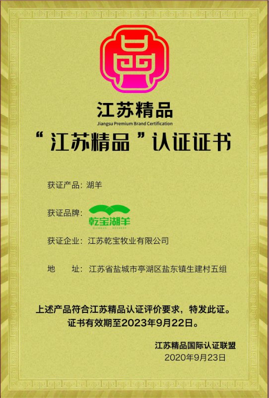 江蘇乾寶牧業(yè)公司將以“江蘇精品”標志的獲得為新的起點,進一步推進管理創(chuàng)新和科技引領(lǐng),堅持規(guī)范化、標準化、精細化管理,努力為社會提供更多的種羊和高品質(zhì)羊肉,促進企業(yè)全產(chǎn)業(yè)鏈發(fā)展,為“江蘇精品”增光添彩。