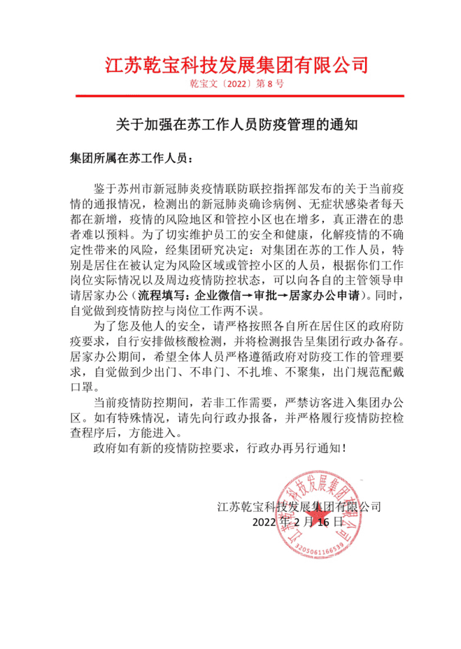 2月13日,乾寶集團緊鑼密鼓準備的全集團2021年度工作總結會暨2022年新年工作會議準備就緒,分布江蘇各地的集團各版塊與會代表紛紛前往集團總部報到參會。2月14日早晨,當集團董事長王躍程獲悉了蘇州市新冠疫情聯防聯控指揮部于當日凌晨發布的《蘇州市疫情防控2022年第7號通告》后,以高度的政治站位和大局意識,嚴格執行關于“全面加強社會面管控,取消全市各類公眾聚集性活動”的通告精神,立刻作出了“關于馬上取消14號全天的集團新年工作會議”的果斷決定。同時,緊急部署防疫抗疫工作,迅速安排外地與會代表有序返程,要求認真按照當地防控疫情的規定,自覺做好核酸檢測和自我隔離工作。集團總部立即召開疫情防控工作部署會議,明確要求集團上下積極行動起來,自覺做到“少出門、不串門、不扎推、不聚集,規范佩戴口罩”。