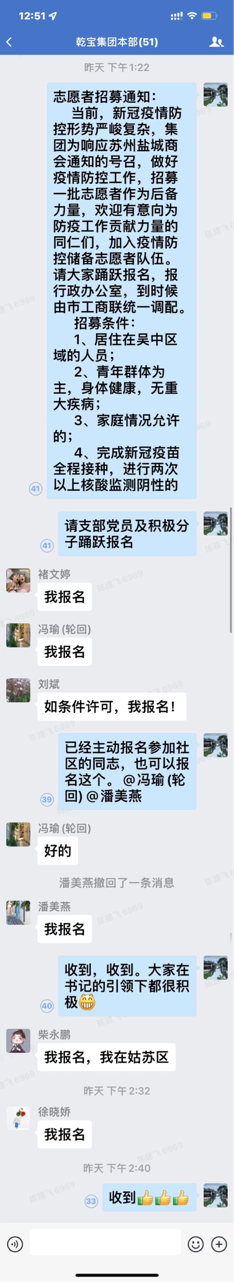 2月18日,集團總部發出“抗疫志愿者招募通知”,黨員和入黨積極分子率先積極響應,起到了良好的帶頭示范作用。在蘇的集團企業板塊和太湖書院各位同仁也紛紛踴躍報名,迅速組建起了一支抗疫志愿者隊伍。