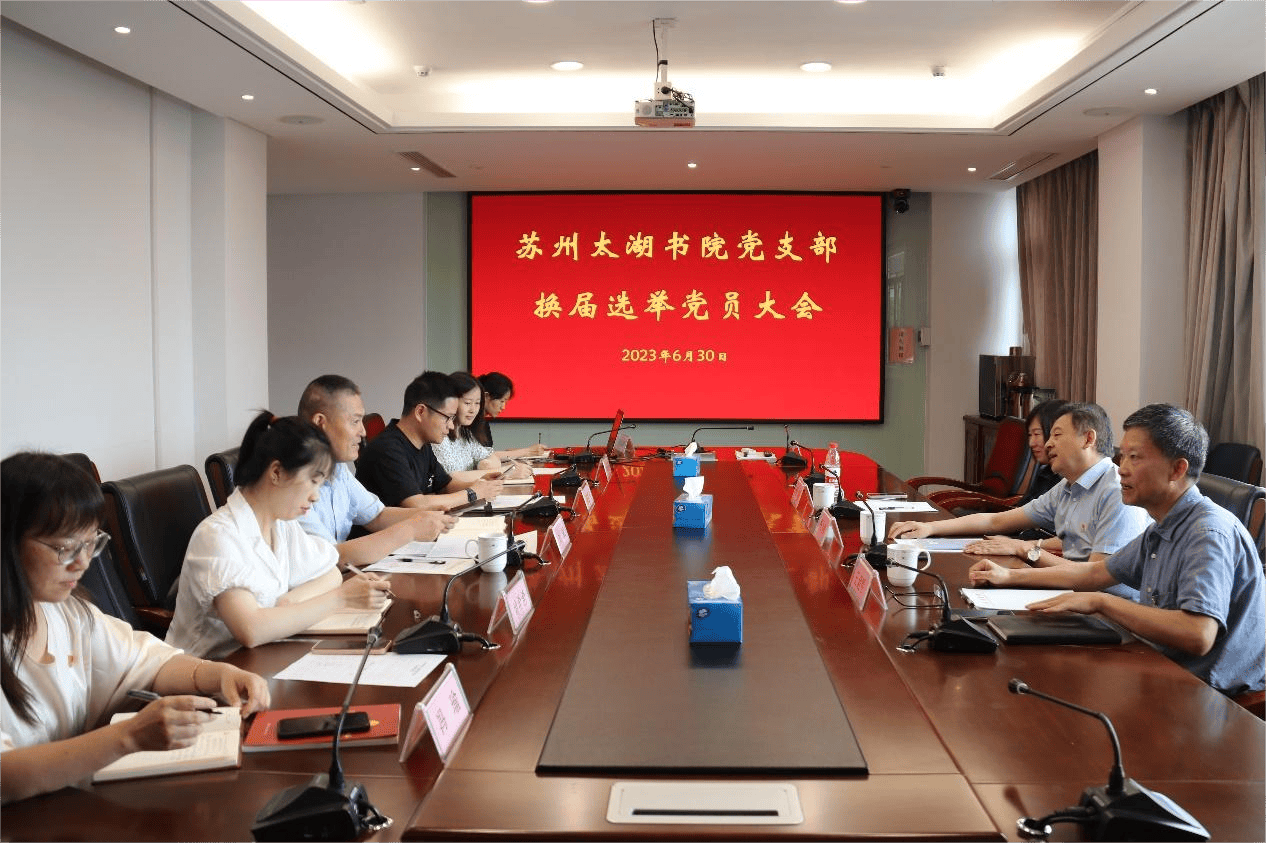 2023年6月30日下午,蘇州太湖書院黨支部在太湖書院三樓會議室舉行換屆選舉大會。出席本次大會的代表有黨支部書記劉斌、副書記陳建飛等全體黨員,蘇州市民政局社會組織黨委書記楊小勇、社會組織紀委委員徐嘉,太湖書院執行院長王建明以及入黨積極分子列席了本次會議,會議由陳建飛同志主持。 會議首先由支...