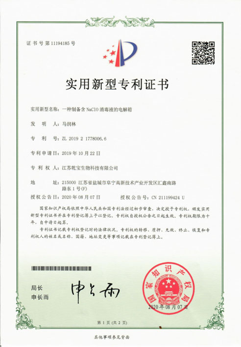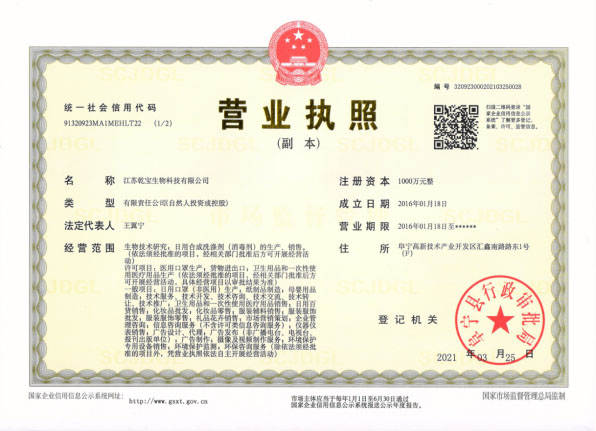 江蘇乾寶生物科技有限公司(簡稱“乾寶生物科技”)位于江蘇省阜寧高新技術產業園區,是一家專業研發和生產消毒殺菌類產品的科技企業。公司技術力量雄厚,擁有多項專利,資質齊全,已通過國家質量管理體系(ISO 9001)、職業健康安全管理體系(ISO 45001)和環境管理體系(ISO 14001)三大體系認證。自2016年初成立以來,公司秉持質量可靠、用戶至上、誠信經營的理念,立足長遠,銳意進取,向廣大消費者提供安全環保的乾寶®消毒液,保障人民的生命健康。