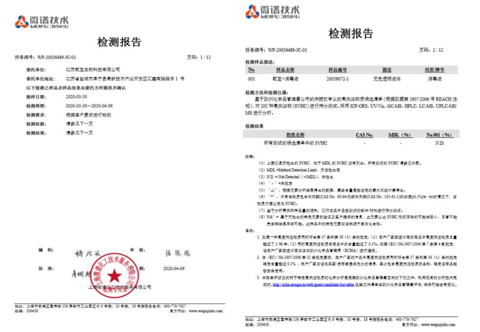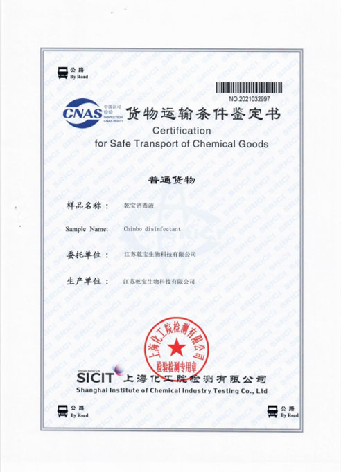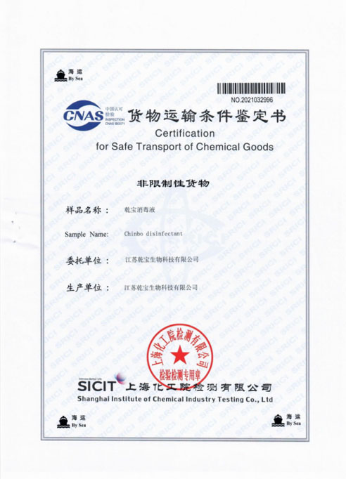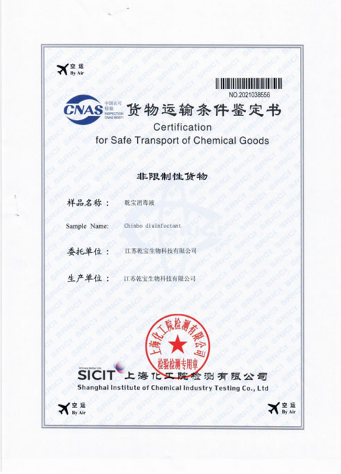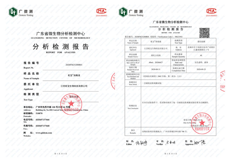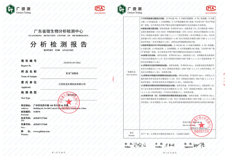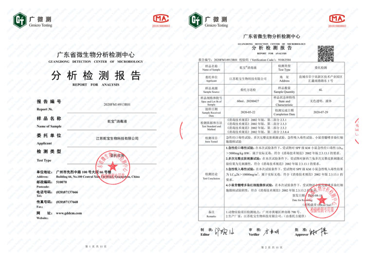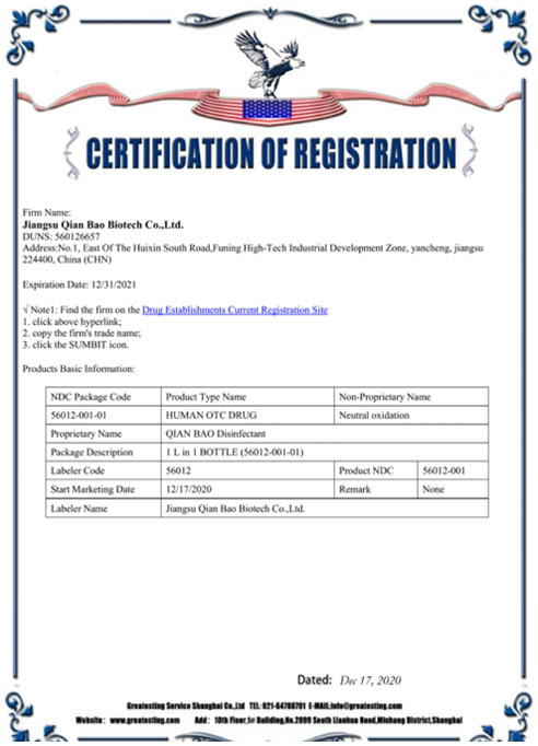 公司研發團隊經過多年持續研發和檢測,成功將實驗室產品轉化為工業化產品,建成了年產過萬噸不燃不爆、安全環保的乾寶®消毒液,并已通過第三方的檢測,取得消毒產品所必須的各類資質。乾寶®消毒液已獲得美國FDA(OTC)注冊證書和歐盟REACH認證,擁有了打開國際市場大門的鑰匙。